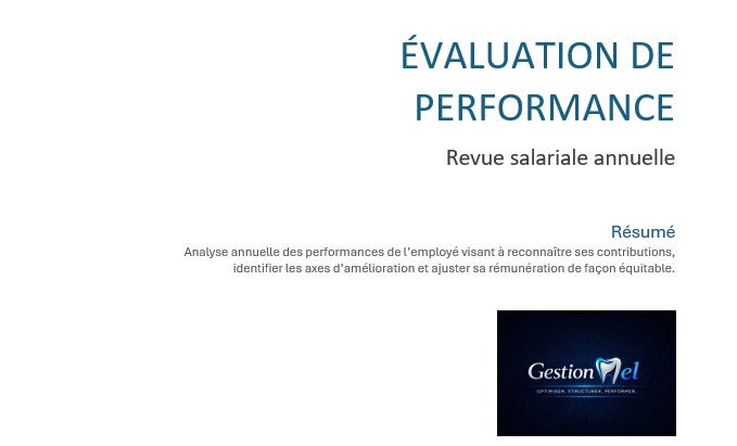 Critères d'évaluation pondérés par catégorie, scores calculés automatiquement, recommandation salariale basée sur la performance, section objectifs pour l'année suivante, commentaires pour chaque critère, rapport imprimable complet. Conçu pour être utilisé avec tous les postes de la clinique dentaire. Achetez une fois pour toute votre équipe.