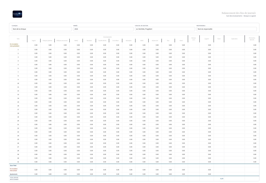 Saisie des encaissements par mode de paiement (comptant, Visa, MC, débit, assurance, chèque), calcul automatique des totaux, détection des écarts, historique mensuel pour conciliation bancaire, rapport journalier imprimable. L'outil que chaque secrétaire dentaire devrait avoir.